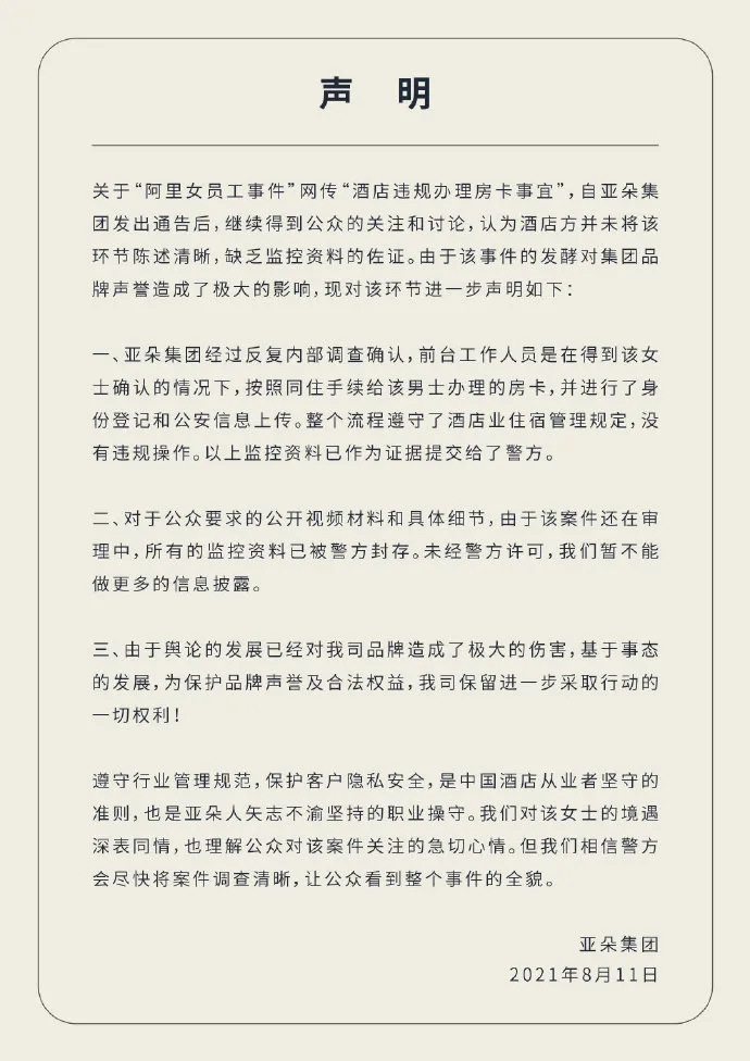 【导读】据亚朵集团官博消息,关于“阿里女员工事件”网传“酒店违规办理房卡事宜”,自亚朵集团发出通告后,继续得到公众的关注和讨论,认为酒店方并未将该环节陈述清晰,缺乏监控资料的佐证。由于该事件的发酵对集团品牌声......[详细]