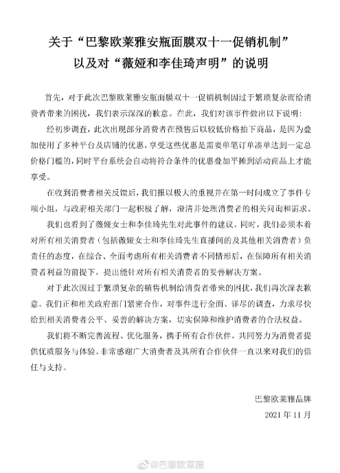 【导读】 米娜时尚网11月18日讯,欧莱雅发布关于“巴黎欧莱雅安瓶面膜双十一促销机制”以及对“薇娅和李佳琦声明”的说明,对于此次巴黎欧莱雅安瓶面膜双十一促销机制因过于繁琐复杂而给消费者带来的困扰,欧......[详细]