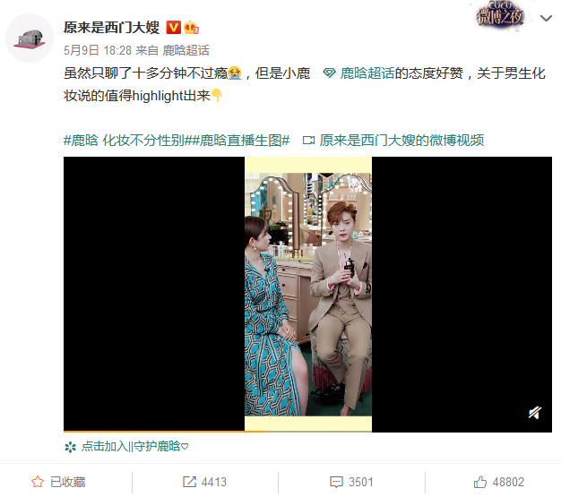 【导读】 最近鹿晗出席品牌活动,在和时尚博主@原来是西门大嫂 一同直播时说到化妆不分性别:“我觉得(化妆)是有必要的,化妆不能分性别,大家都可以的,只要自己喜欢。”不管是男生还是女生,都有化妆的权利......[详细]