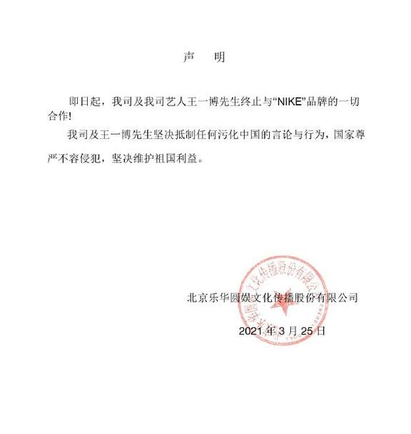 【导读】3月25日消息 今早,乐华娱乐发布声明称,即日起,我司及我司艺人王一博先生终止与“NIKE”品牌的一切合作!我司及王一博先生坚决抵制任何污化中国的言论与行为,国家尊严不容侵犯,坚决维护祖国利益。近日,......[详细]