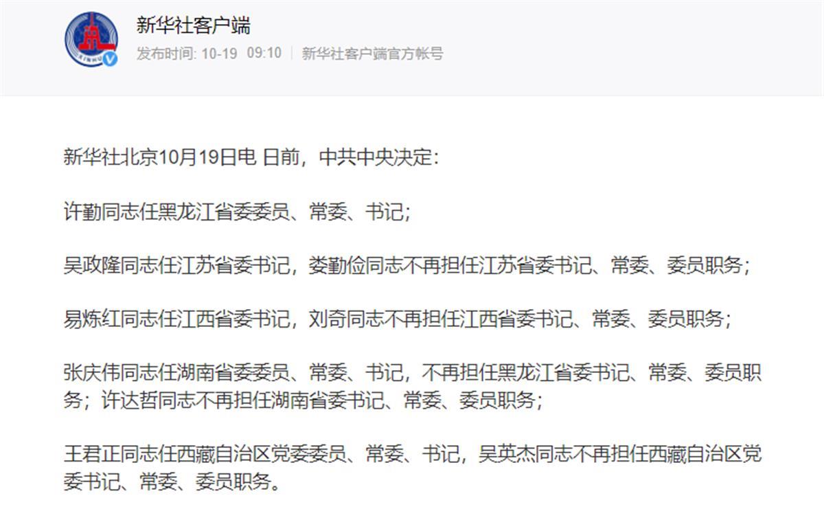 【导读】10月19日消息,日前,中共中央决定:许勤同志任黑龙江省委委员、常委、书记;吴政隆同志任江苏省委书记,娄勤俭同志不再担任江苏省委书记、常委、委员职务;易炼红同志任江西省委书记,刘奇同志不再担任江西省委......[详细]