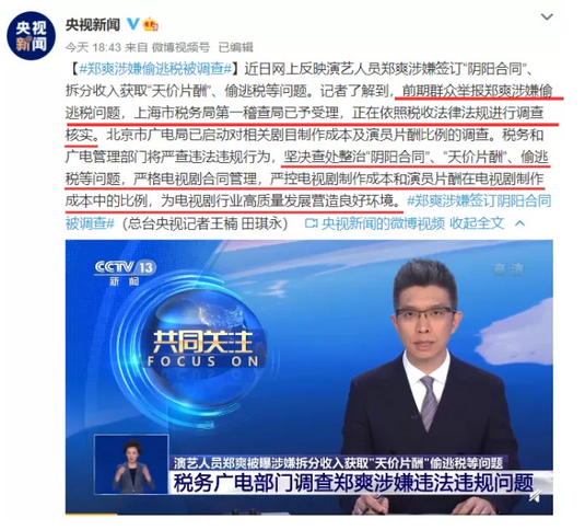 【导读】 4月26日,自张恒公开聊天记录疑曝光郑爽签订“阴阳合同”一事后,引发了娱乐圈巨大热议,经过两天的发酵,4月28日,央视新闻就郑爽涉嫌签订“阴阳合同”一事正式公开报道,上海税务局第一稽查局就......[详细]