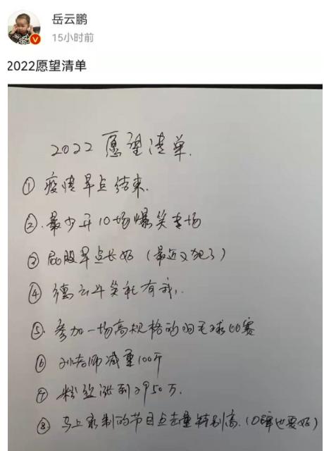 【导读】岳云鹏晒出8条愿望清单,直言希望孙越能减重100斤,接下来就让我们一起来看看具体的消息介绍,希望对大家有所帮助,感兴趣的话记得跟朋友一起分享。 1月11日,岳云鹏在社交媒体晒出自己2022年......[详细]
