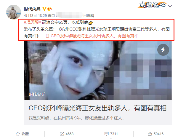 【导读】4月13日,一个叫时代尖兵的kol在微博上发布了一篇文章,名为《杭州CEO张科峰曝光女孩王项思醒出轨富二代等多人,有图有真相》。u1s1,饭姐并不认识文中提到的百万级网红。然而,通过65页高清图文以及......[详细]